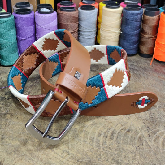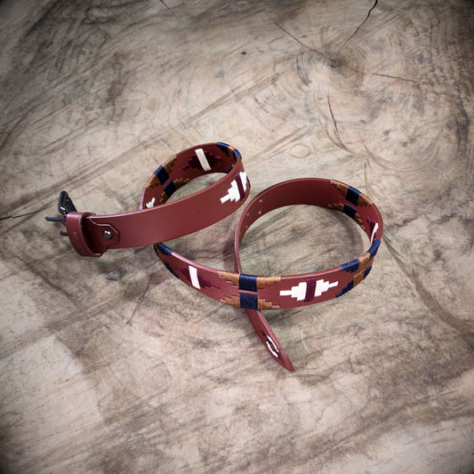 HUELLA – Lo que Dejas al Pasar Dice Quién Eres | Cuero brandy con tejido en hilo miel, azul oscuro, vino tinto y beige – Cinturón tejido CASTAFINA clásico (Ref. TC-049)