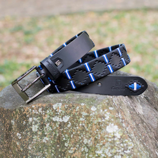 IMPULSO – Energía que Deja Huella | Cuero negro con hilos azul rey, azul cielo y blanco – Cinturón tejido CASTAFINA clásico (Ref. TC-011)