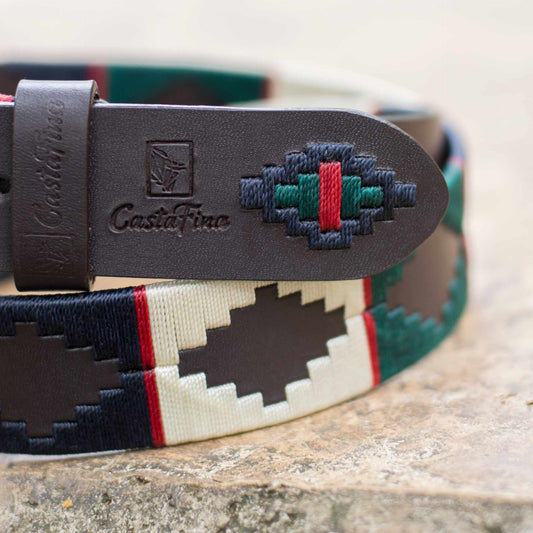 VIGOR – Energía que Impulsa con Estilo | Cuero chocolate con tejido en verde, beige, azul y rojo intenso – Cinturón tejido CASTAFINA clásico (Ref. TC-026)