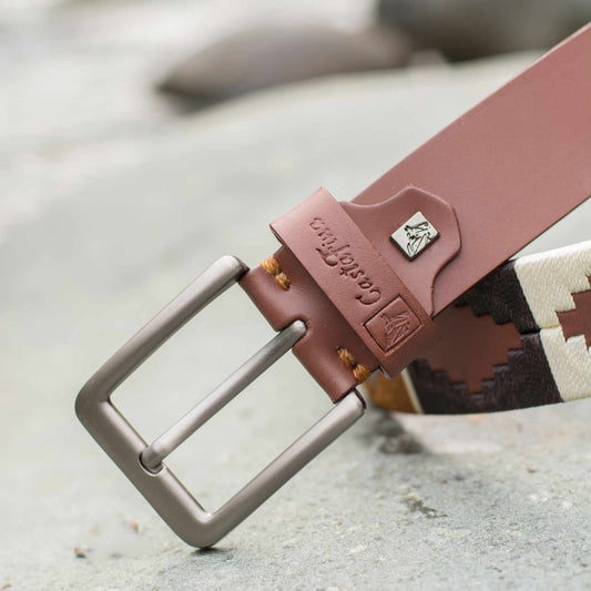 TRIBUTO – Orgullo que se Lleva con Historia | Cuero brandy con tejido en tonos tierra – Cinturón tejido CASTAFINA clásico (Ref. TC-016)