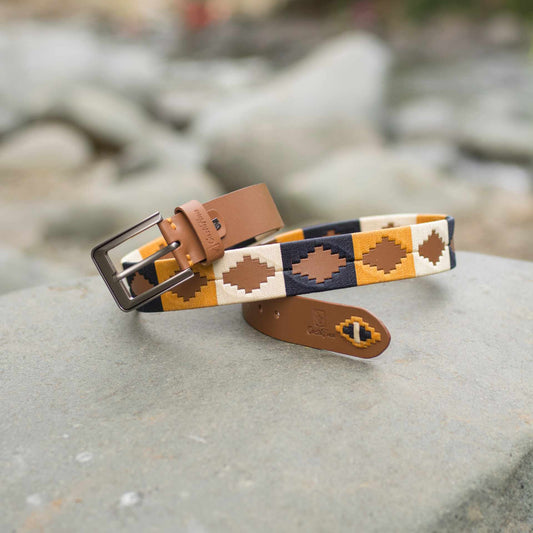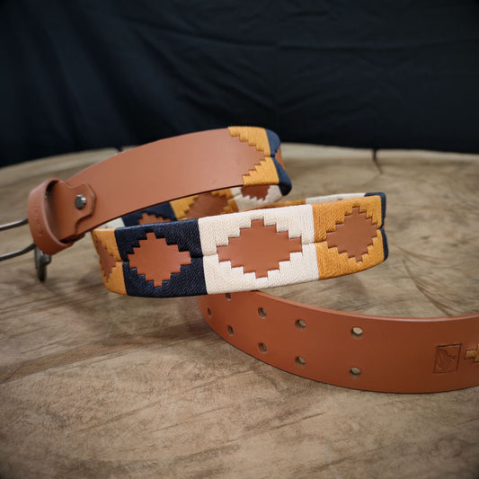 LEGIÓN – Fortaleza que Une Tradición y Estilo | Cuero miel con tejido azul turquí, mostaza y beige – Cinturón tejido CASTAFINA clásico (Ref. TC-015)