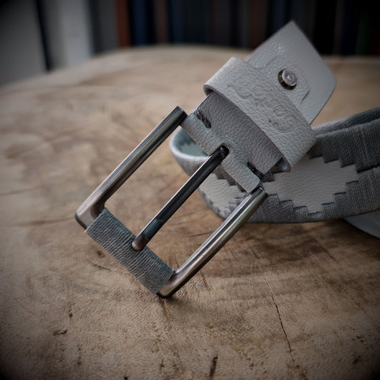 LÚMEN – Elegancia que Ilumina con Discreción | Cuero gris hielo con hilo gris perla – Cinturón tejido CASTAFINA Platino (Ref. TC-025)