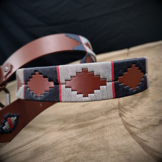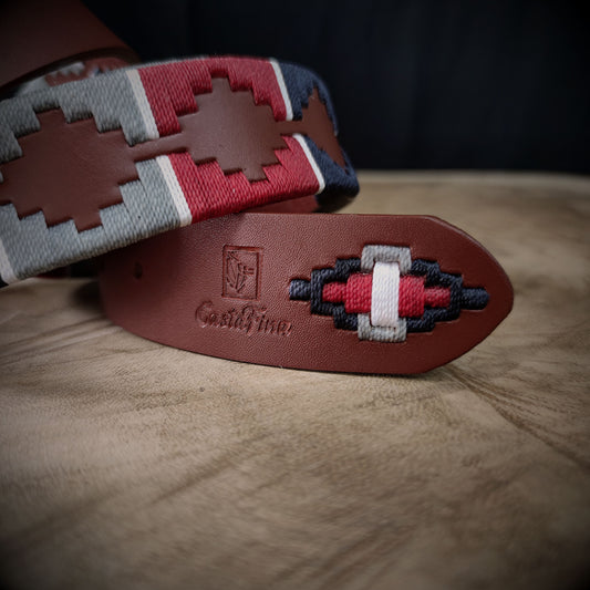 SENDA – Camino de Fortaleza | Cuero brandy con tejido en gris, azul oscuro y apliques rojos – Cinturón tejido CASTAFINA clásico (Ref. TC-035)