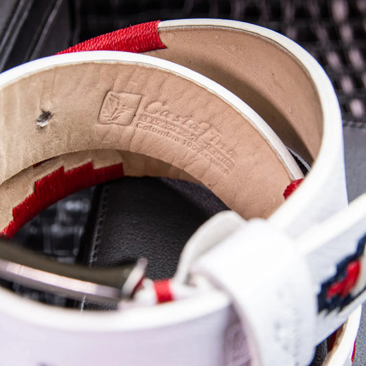 ALBOR – El Comienzo de Tu Poder | Cuero blanco con hilos rojo, azul y blanco – Cinturón tejido CASTAFINA clásico (Ref. TC-118)