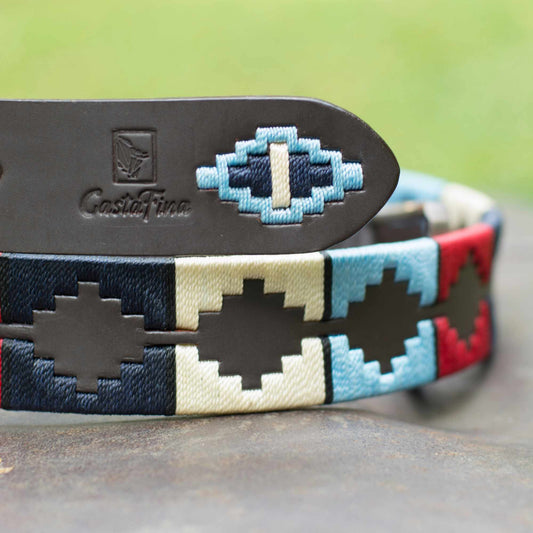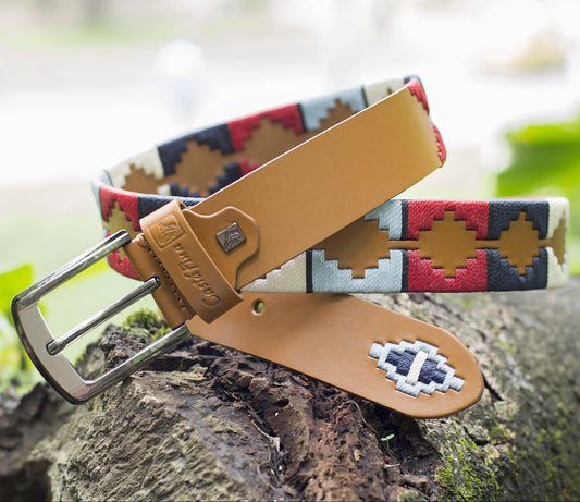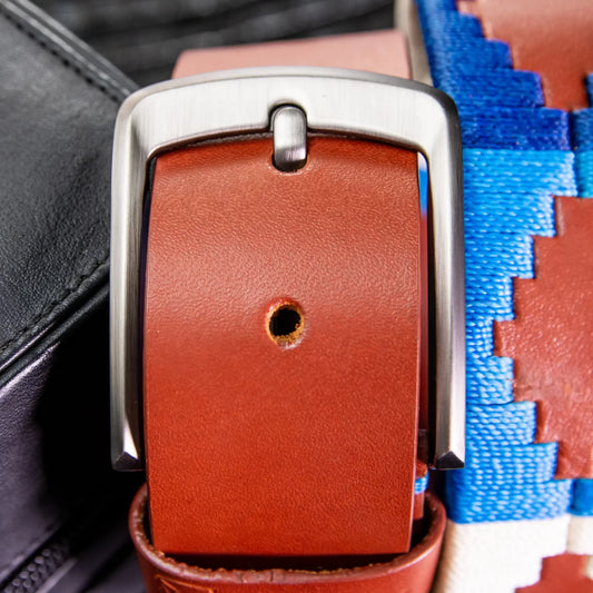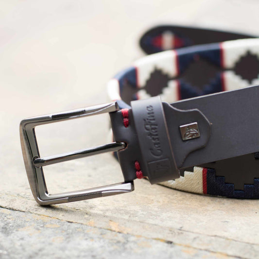 SANGRE AZUL – Elegancia que Impone Respeto | Cuero brandy con tejido rojo, azul turquí y blanco – Cinturón tejido CASTAFINA clásico (Ref. TC-028)