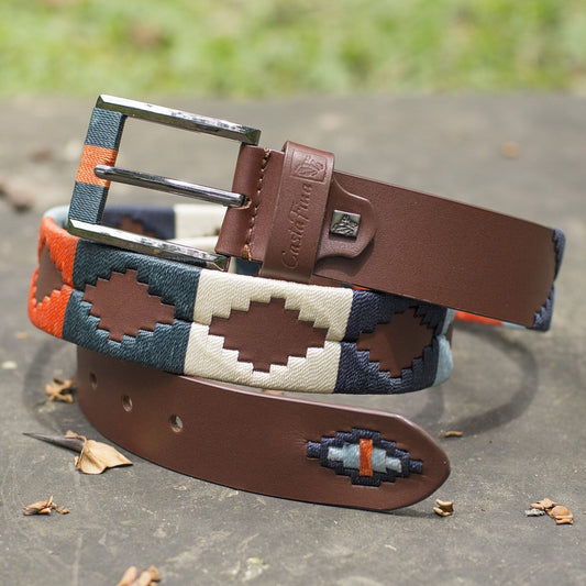 RASTRO – Estilo que deja huella | Cuero brandy con hilos azul turquí, brandy y blanco – Cinturón tejido CASTAFINA clásico (Ref. TC-013)