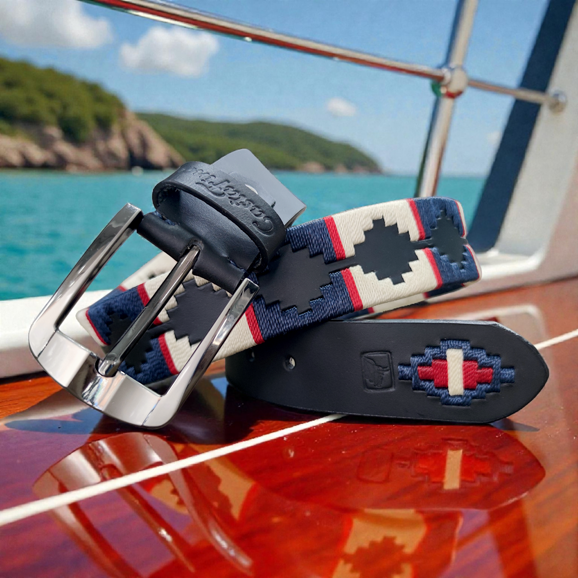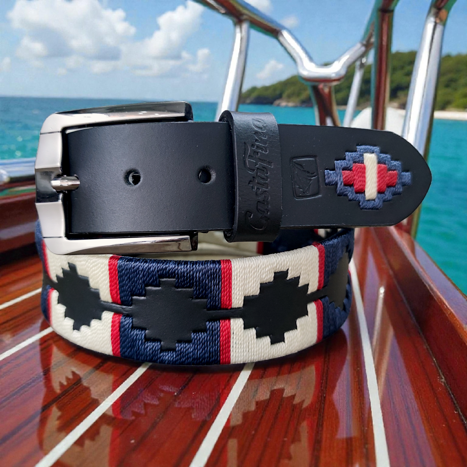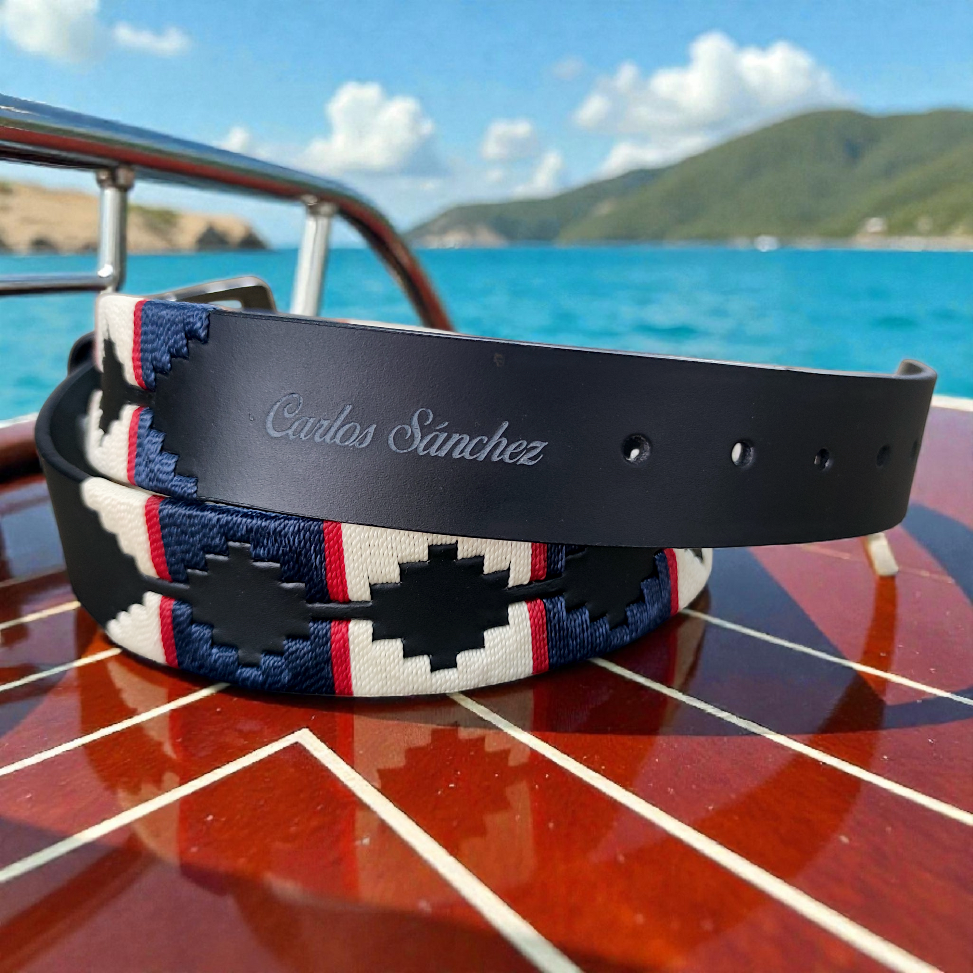 Una pieza creada para hombres que no le temen a la profundidad. ALTAMAR representa libertad, dirección propia y carácter firme. Su cuero negro intenso se combina con un tejido artesanal en hilos azul noche y beige, acompañado de apliques rojos que aportan energía y determinación. Un contraste elegante que transmite fuerza sin perder sobriedad.
