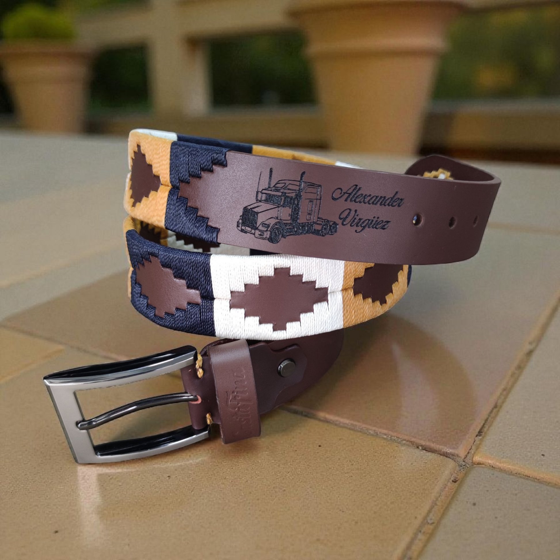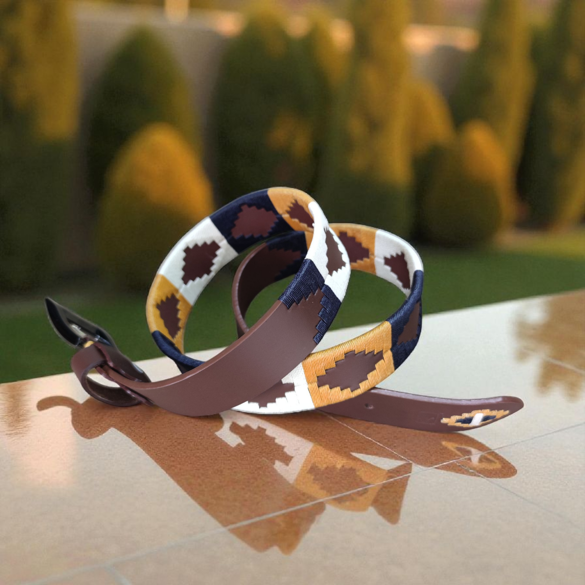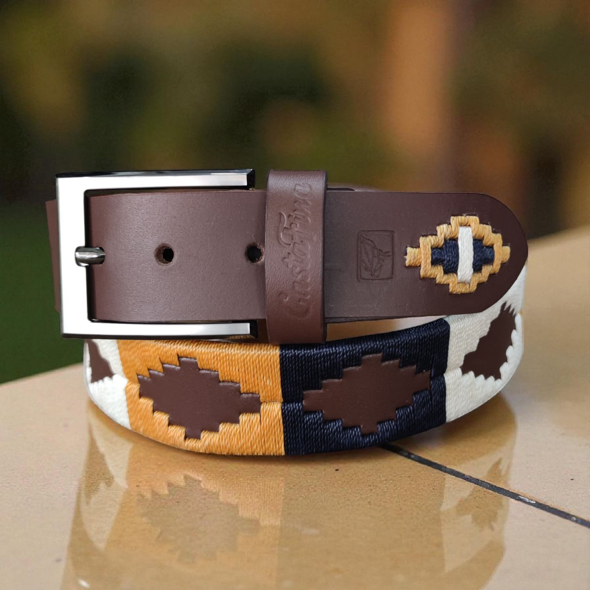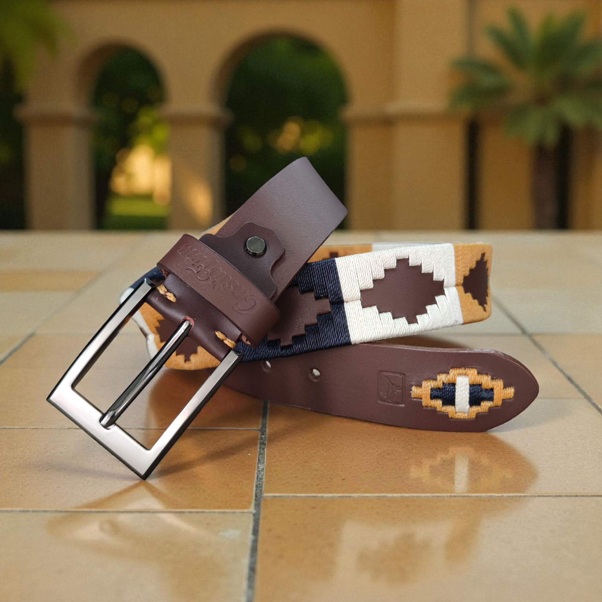 Hay cinturones que hablan por ti antes de que digas una palabra. Este diseño une cuero chocolate con un tejido firme en azul oscuro, beige y mostaza para crear una pieza con carácter, profundidad y un estilo que impone sin esfuerzo. Es un cinturón creado para hombres que entienden que la verdadera elegancia está en los detalles.