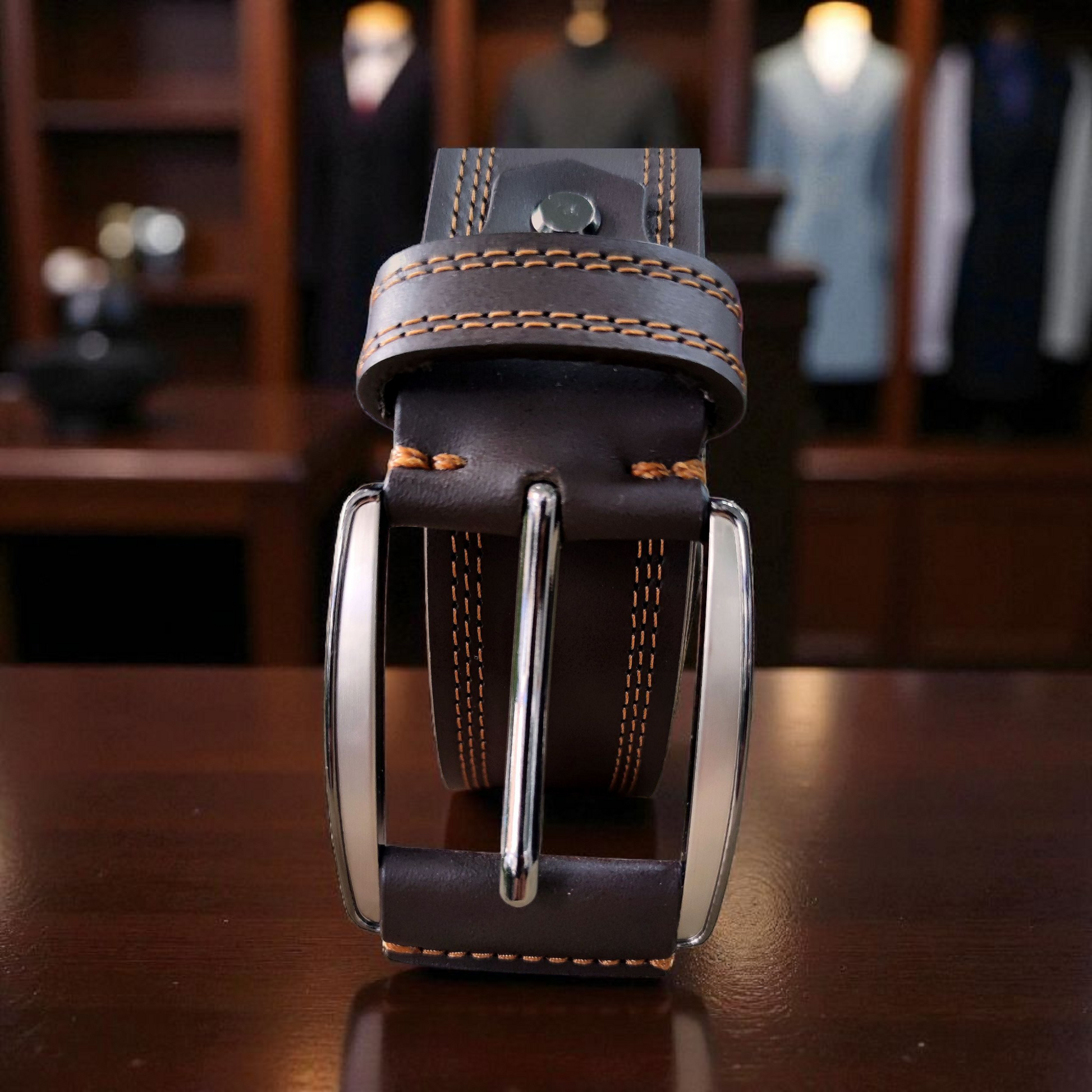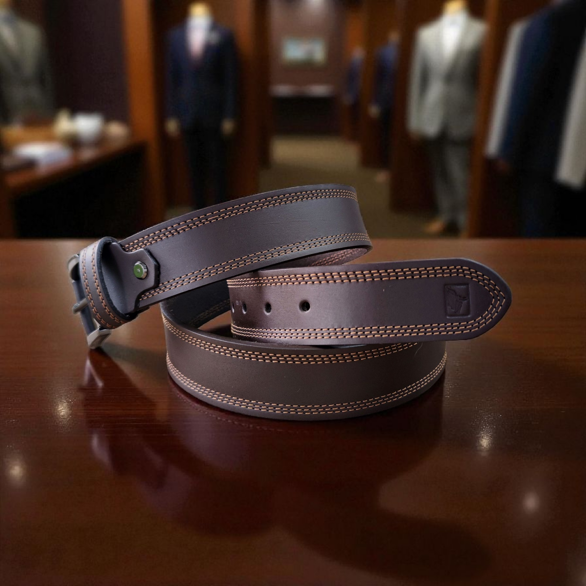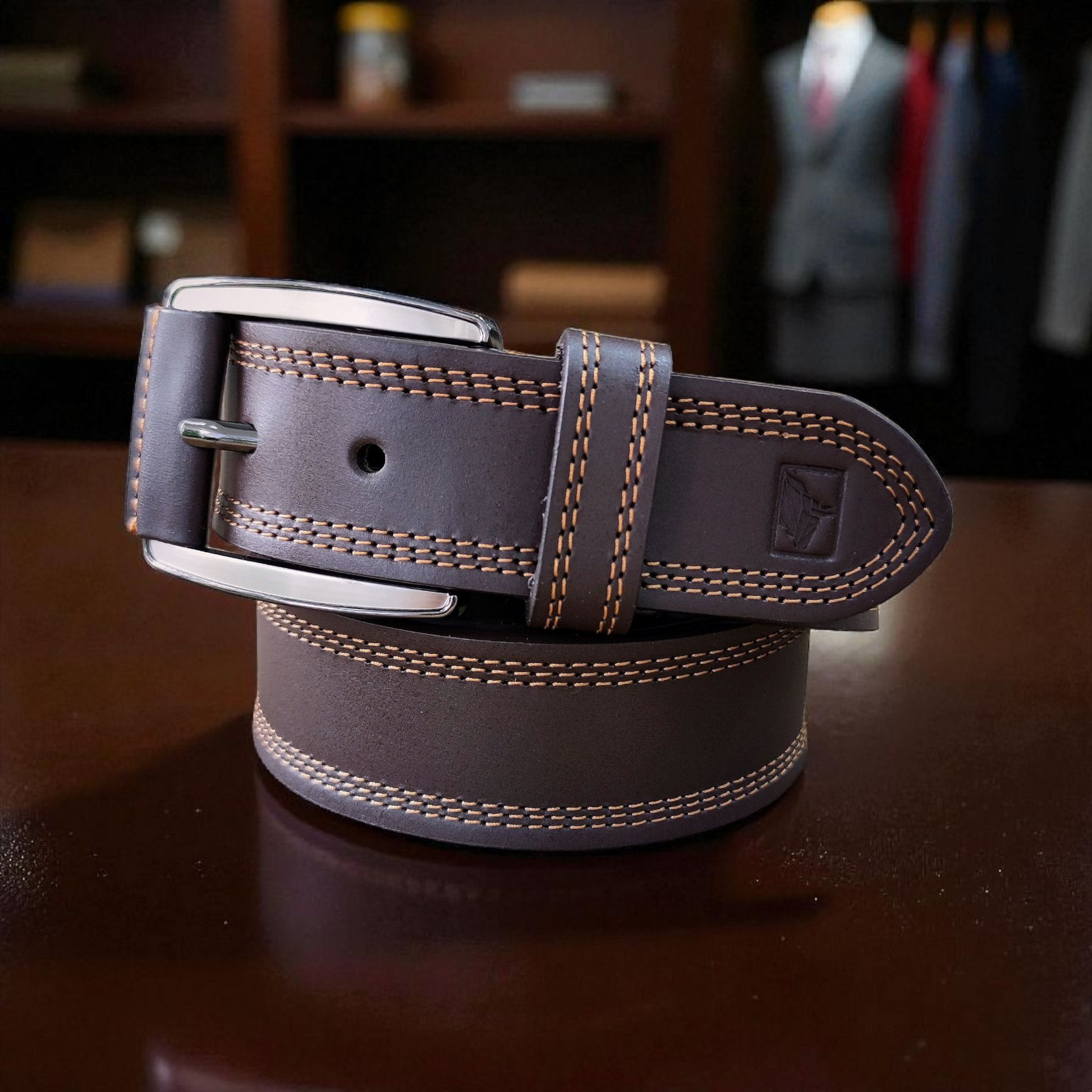 TERRITORIO es un cinturón que evoca fuerza, raíces profundas y un estilo que no se disculpa. El cuero café intenso, combinado con costuras miel meticulosamente alineadas, transmite seguridad y distinción en cada detalle.