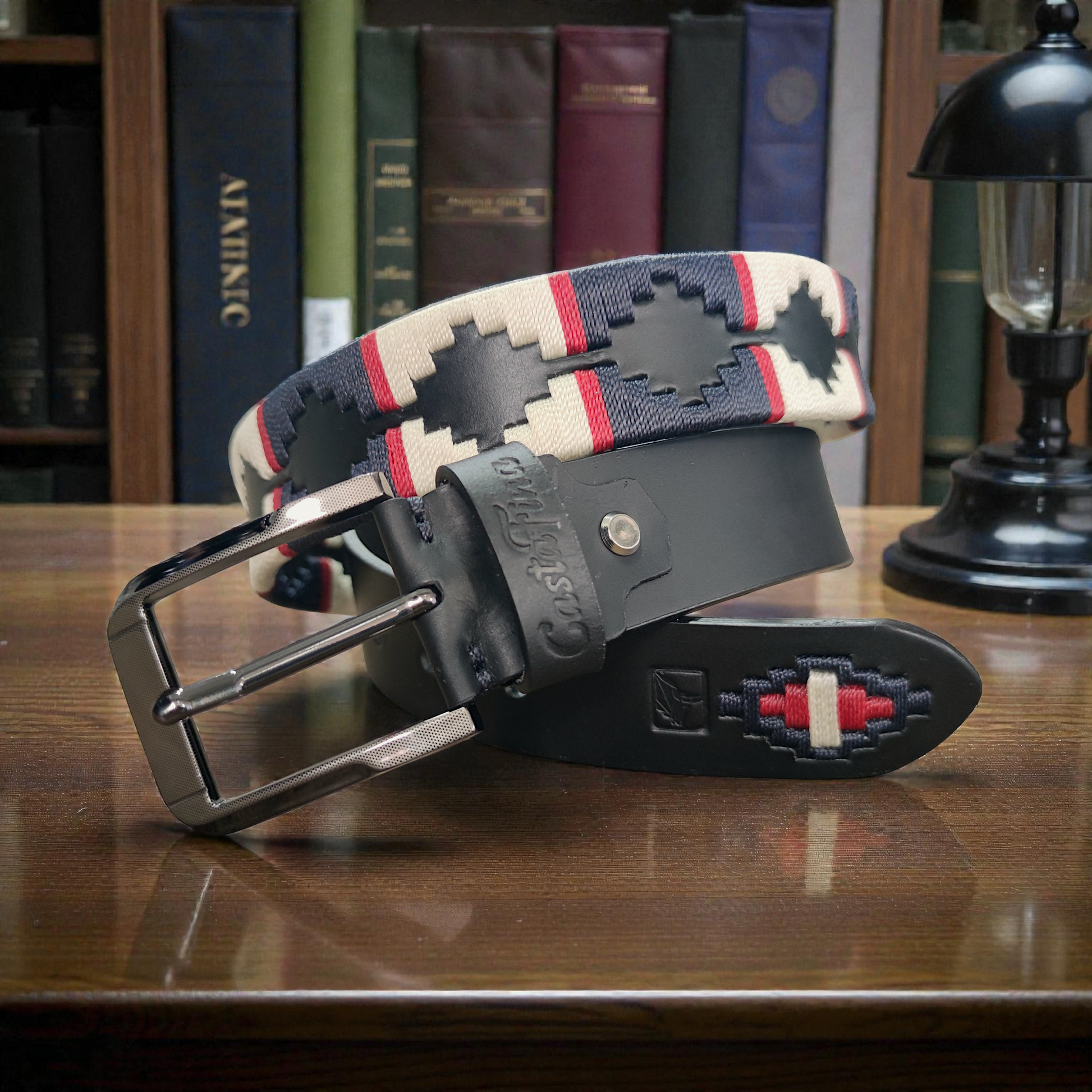 Una pieza creada para hombres que entienden el verdadero significado de la elegancia clásica. El cuero negro profundo se combina con un tejido artesanal en hilos beige y azul noche, acompañado de sutiles apliques rojos que aportan carácter y personalidad sin perder sobriedad. Un cinturón de 4 cm de ancho, firme y equilibrado, pensado para acompañar cualquier estilo con distinción real.