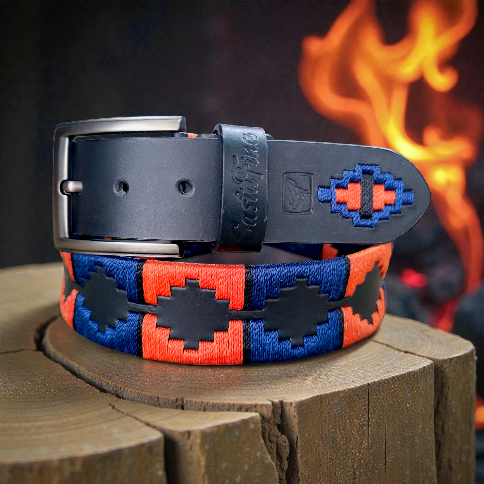 Este cinturón tejido CASTAFINA está elaborado en cuero negro legítimo, combinado con un tejido artesanal de alto impacto en hilos azul rey y naranja, acompañado de apliques negros que refuerzan su fuerza visual. Una composición intensa y equilibrada, inspirada en la energía, el poder y la determinación del dragón.