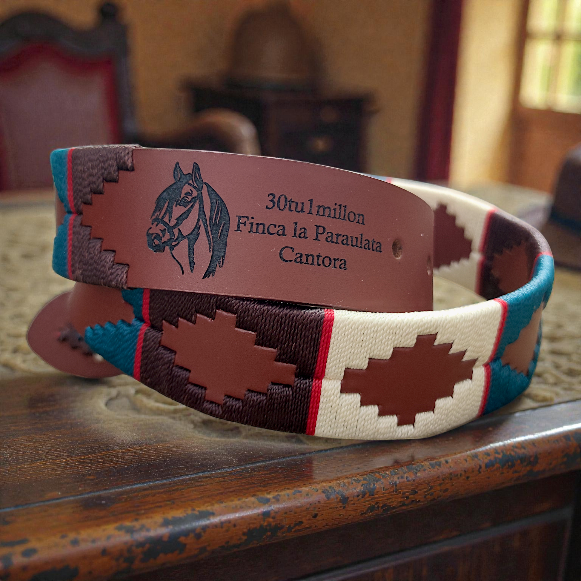Una pieza creada para hombres que honran la tradicion, el caracter y el valor de lo autentico. El cuero brandy profundo se combina con un tejido artesanal lleno de matices, donde los hilos beige, verde agua marina oscuro y cafe rojizo se integran con apliques rojos que aportan fuerza visual y personalidad. Un cinturon de 4 cm de ancho, solido y expresivo, pensado para quienes llevan su historia con orgullo.