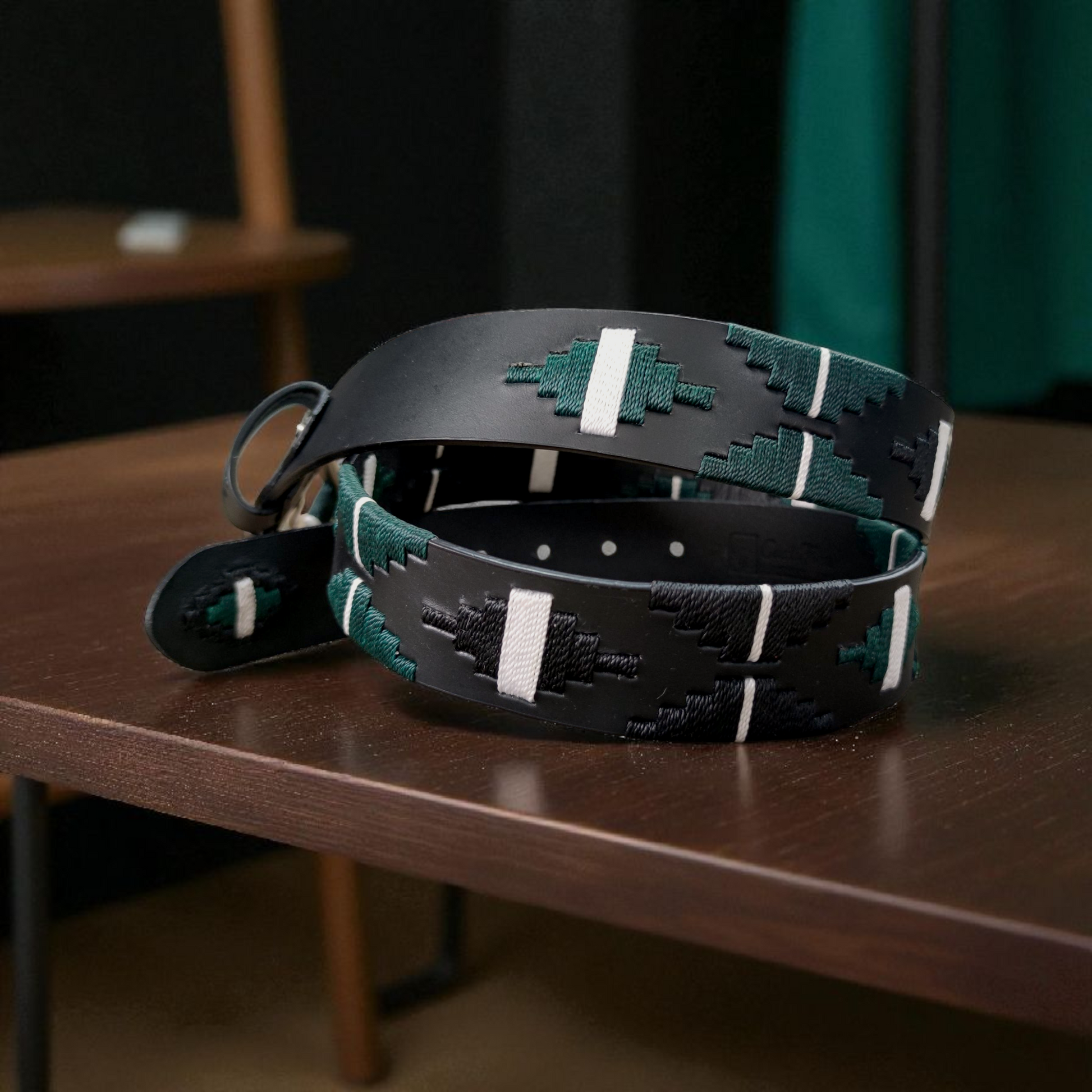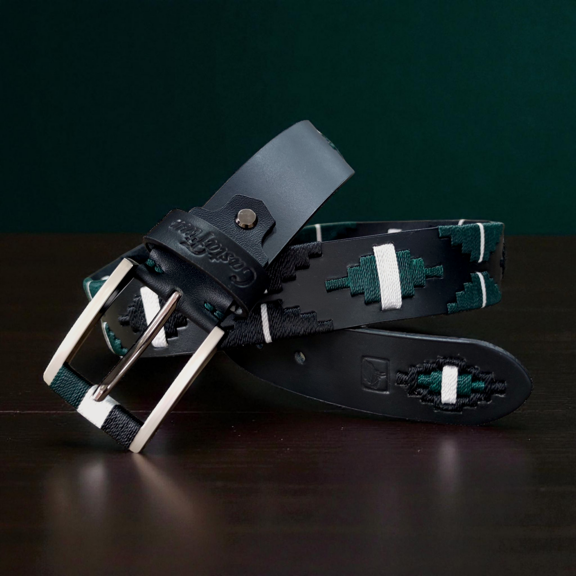 Este diseño fue creado para hombres que buscan un estilo sobrio, elegante y con carácter firme. El cuero negro se combina con un tejido en verde oscuro, blanco y negro, creando una pieza equilibrada, poderosa y hecha para quienes valoran la distinción en cada detalle.