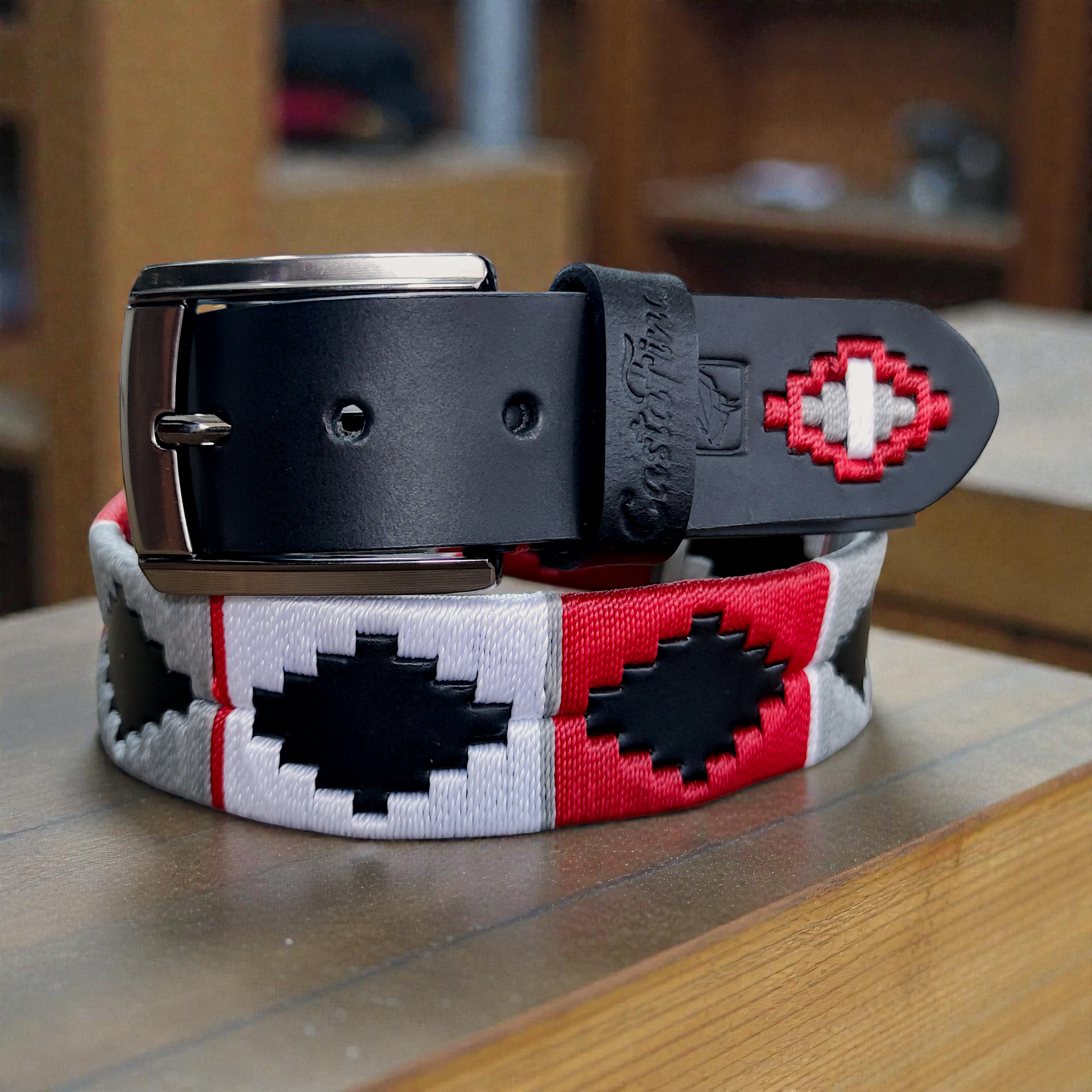 Una pieza creada para hombres que entienden el valor del prestigio real. El cuero negro profundo se fusiona con un tejido artesanal en hilos rojo, gris y blanco, logrando un equilibrio perfecto entre elegancia clásica y carácter decidido. Un cinturón de 4 cm de ancho, sólido y refinado, pensado para destacar con autoridad sin excesos.