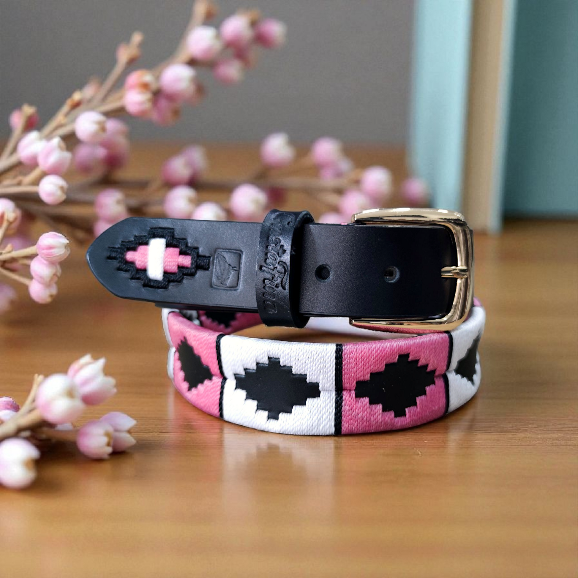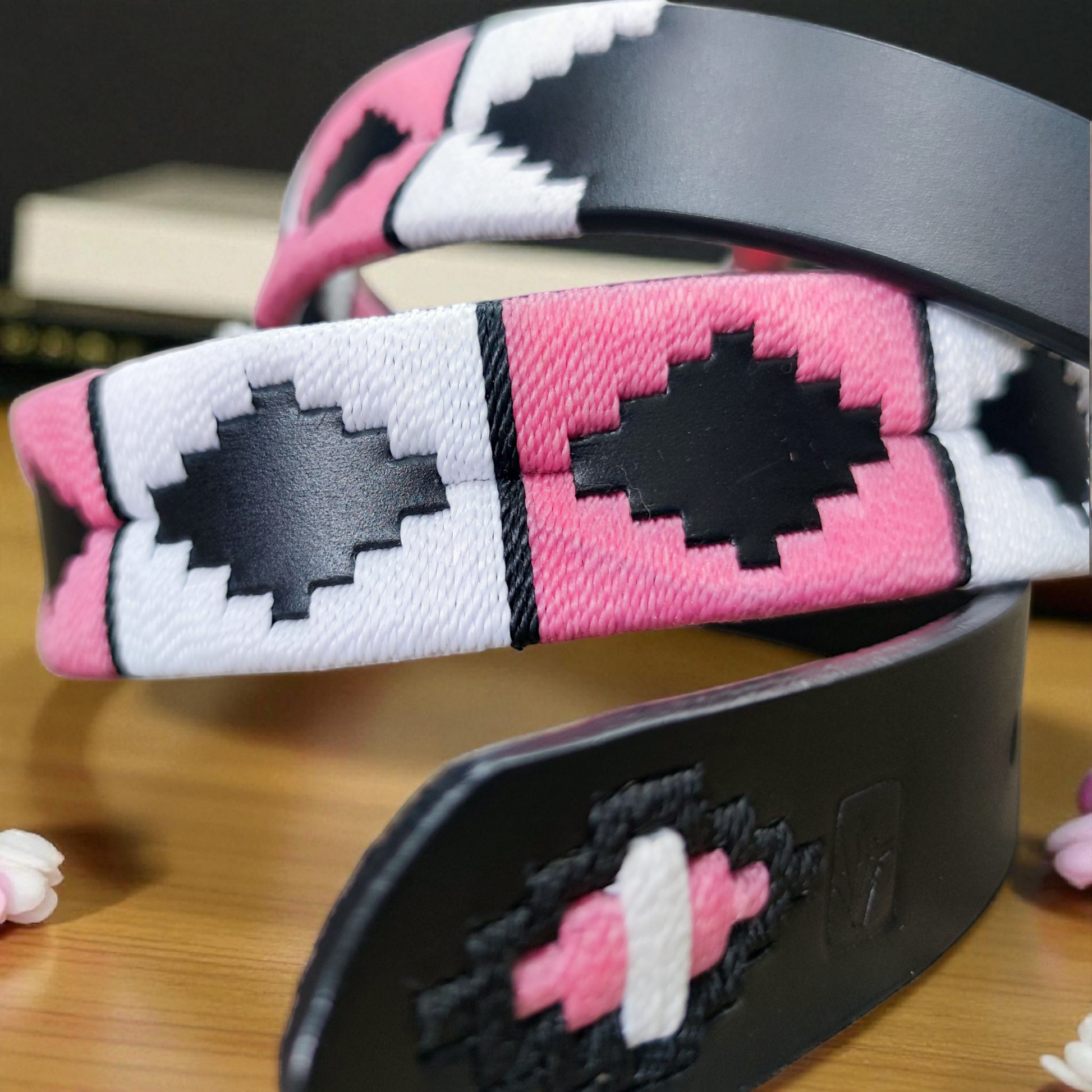 ALBA ROSA es esa pieza que mezcla suavidad, actitud y un toque de misterio en cada detalle. Un cinturón femenino, vibrante y con carácter, tejido a mano en tonos rosa intenso, blanco puro y negro profundo sobre cuero negro legítimo.