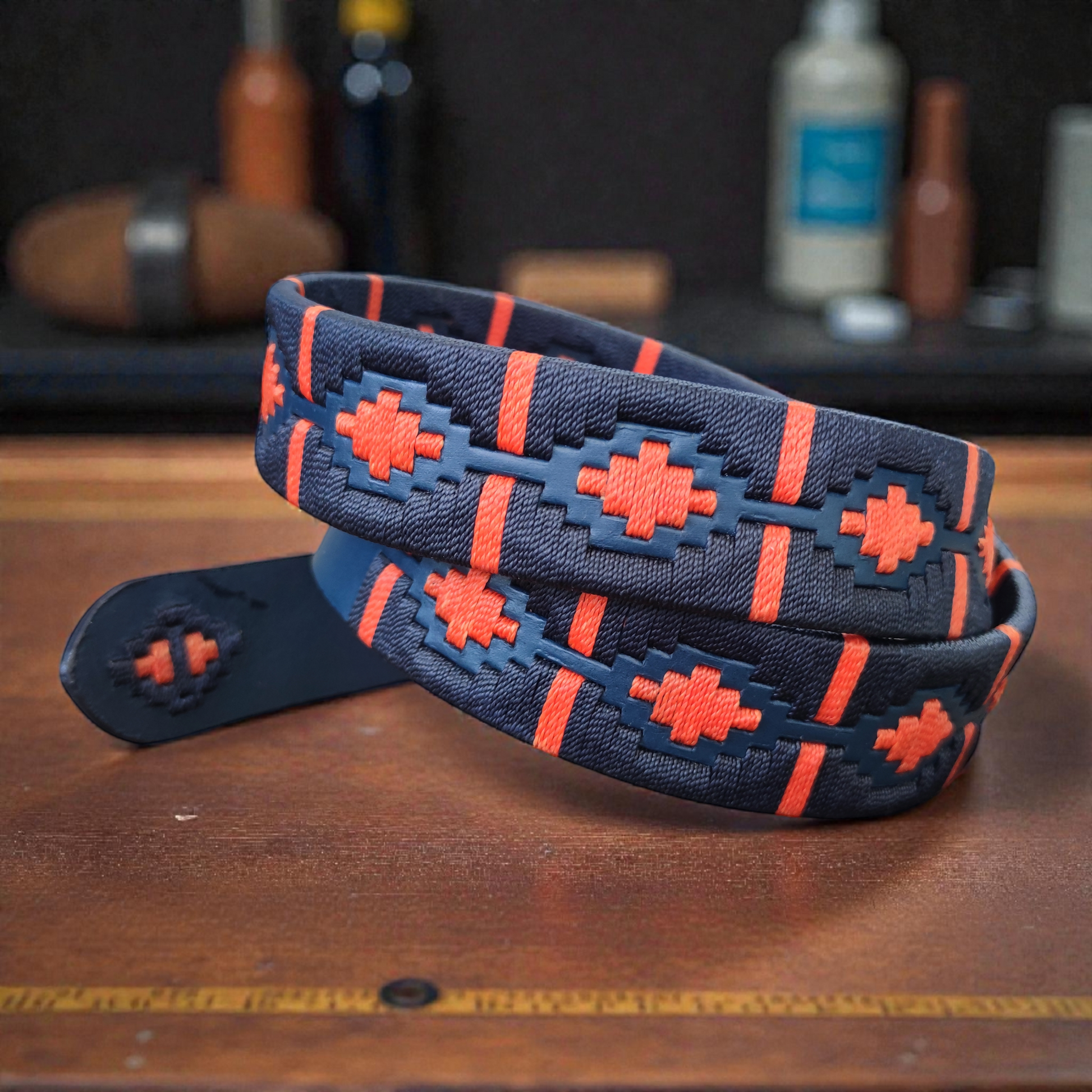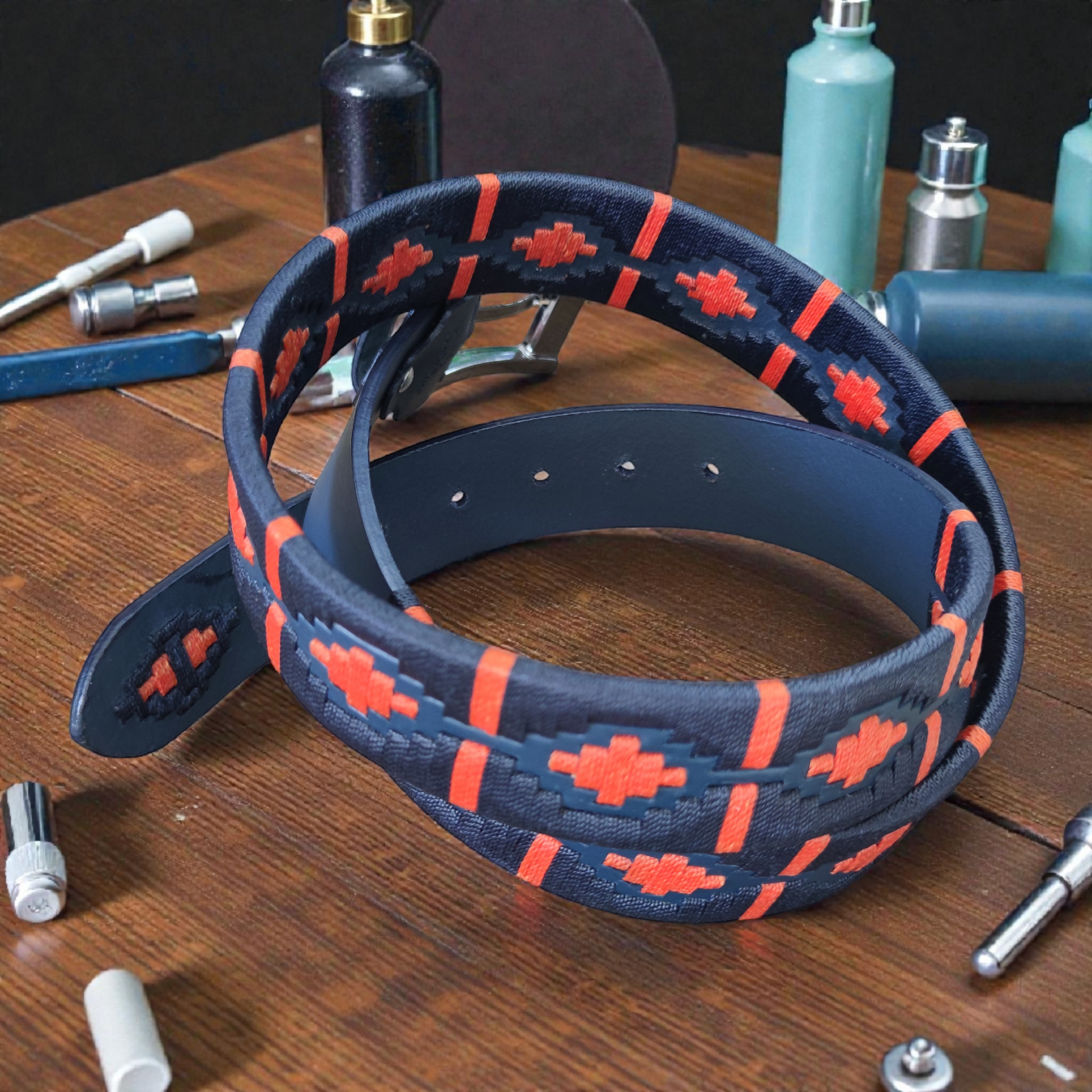 Una pieza creada para hombres que proyectan seguridad, elegancia moderna y carácter propio. El cuero azul oscuro profundo se combina con un tejido artesanal en hilos azul oscuro y naranja, logrando un contraste preciso que transmite energía, personalidad y un estilo contemporáneo sin perder sobriedad. Un cinturón de 4 cm de ancho, firme y equilibrado, diseñado para destacar con clase en cualquier ocasión.